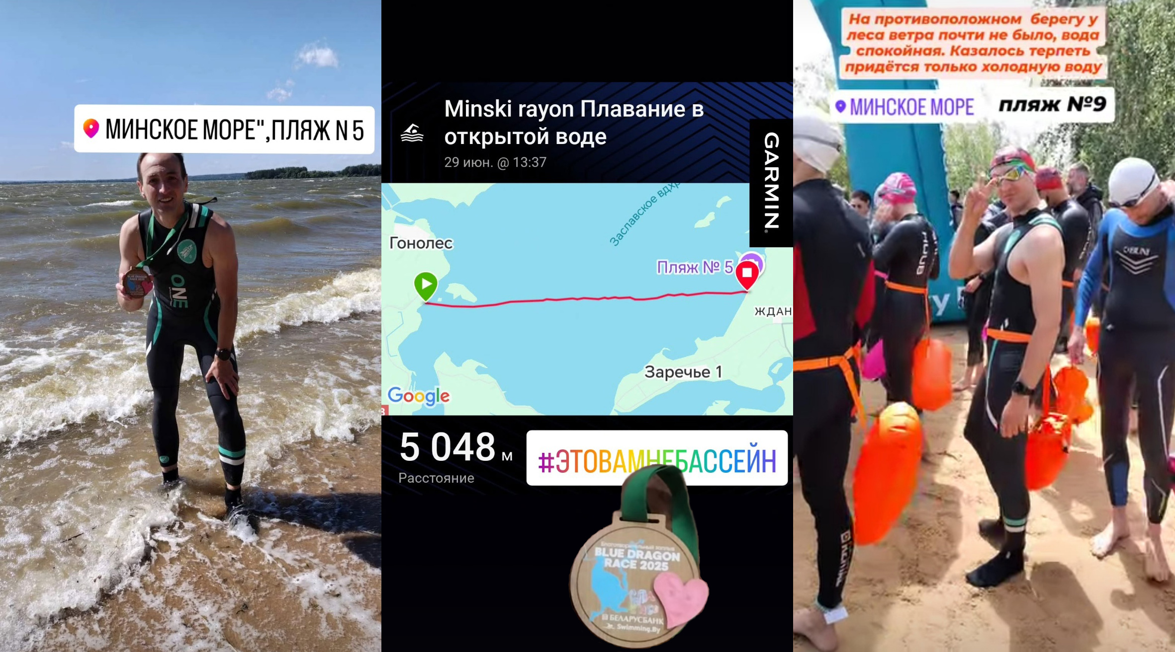 «Мерапрыемства праходзіла на Мінскім моры, трэба было пераадолець дыстанцыю 5 км. Ліміт часу для праходжання дыстанцыі да 3 гадзін. Надзея была на цёплае зацішнае надвор'е, але, на жаль, усё было зусім наадварот. Моцны вецер, вада +18 градусаў, у паветры крыху цяплей +22. Бліжэй да старту вецер узмацніўся і за 15 хвілін да старту арганізатарамі было прынята рашэнне змяніць напрамак.